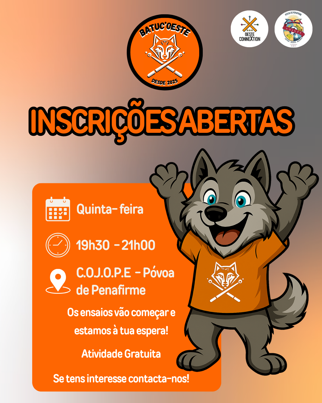 Se já nos viste a espalhar ritmo, energia e alegria pelas ruas e eventos do Oeste, talvez já tenhas sentido aquela vontade de pegar num tambor e juntar-te à festa. Pois bem… agora é a tua oportunidade! A batucada mais animada do Oeste está de portas abertas para novos elementos, e queremos contigo fazer ainda mais barulho, música e sorrisos.