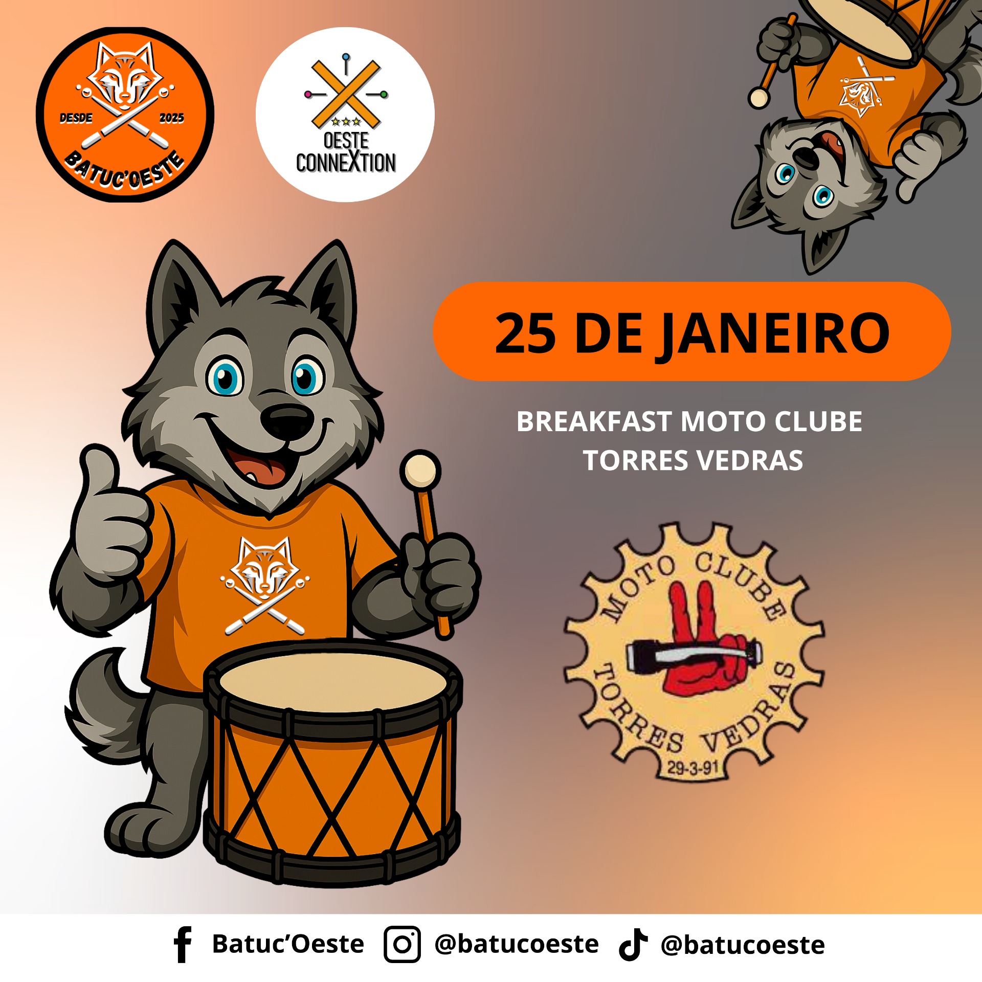 No passado dia 25 de janeiro, os Batuc'Oeste marcaram presença no Breakfast promovido pelo Moto Clube de Torres Vedras, levando ritmo, energia e boa disposição a uma manhã de convívio e partilha. Esta atuação representou a 26.ª apresentação do grupo, reforçando o seu percurso e a ligação contínua à comunidade local.