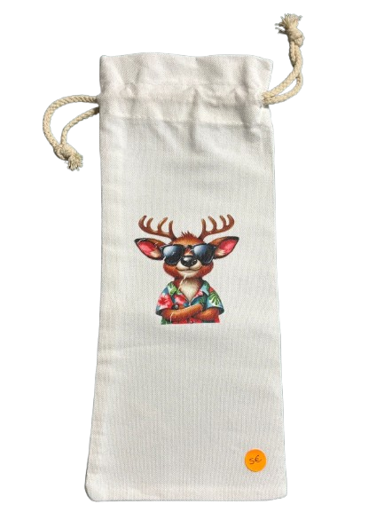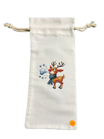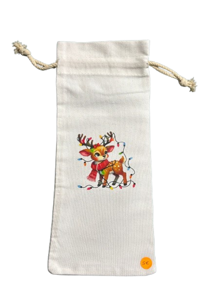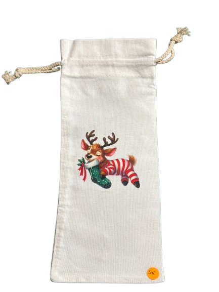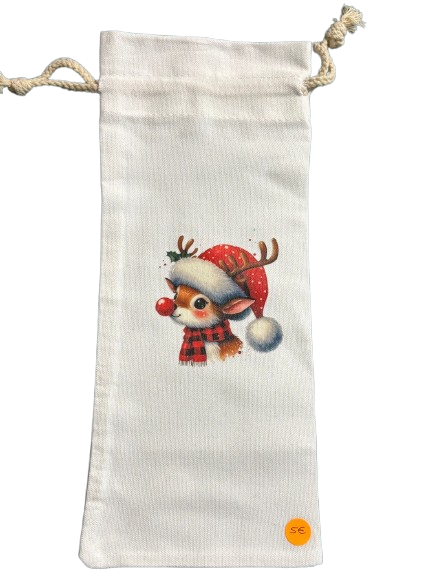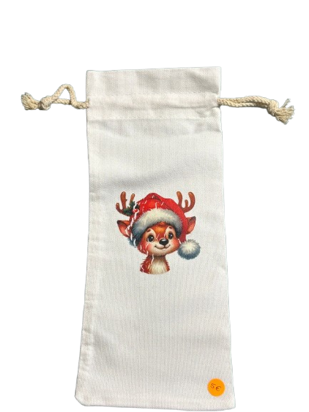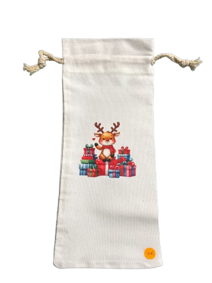 Saco para colocar garrafa estampado com figuras do Natal.